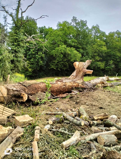 Notre cliente sur cette intervention souhaitait vendre sa maison mais un chêne situé sur son terrain était très proche du bâti et il était mort depuis plusieurs années. C’était un miracle qu’il soit encore debout. Ce chêne était situé à proximité d’un terrain agricole et nous avons dû faire déplacer un engin pour pouvoir intervenir et le couper. Le voisin a demandé à récupérer les troncs, puis nous avons débité une autre benne de bois pour pouvoir livrer un client qui cherchait du bois de chauffage.